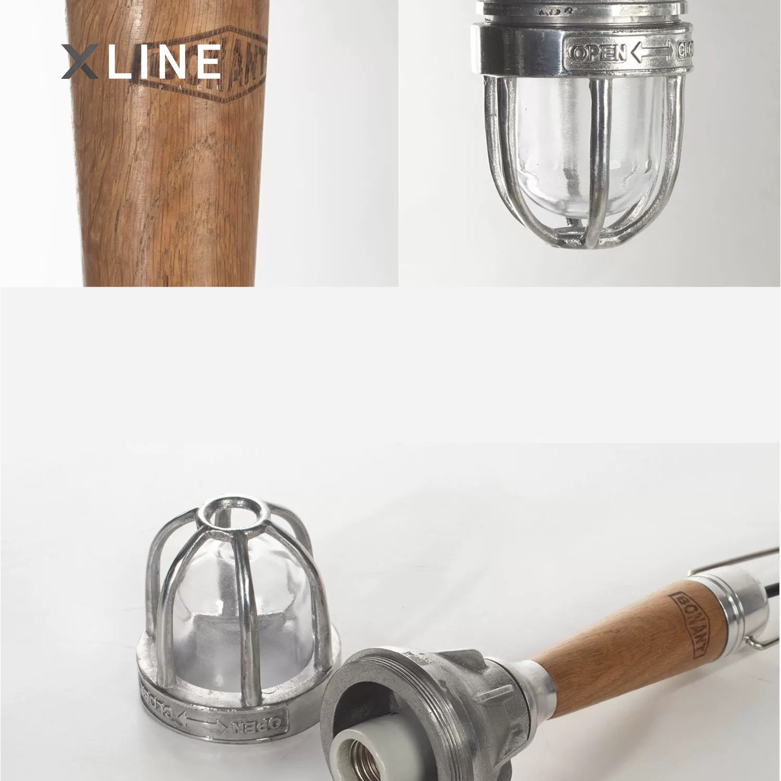 | Main Materials | Cast aluminum (vintage handcrafted polish) + glass lampshade + oak handle |